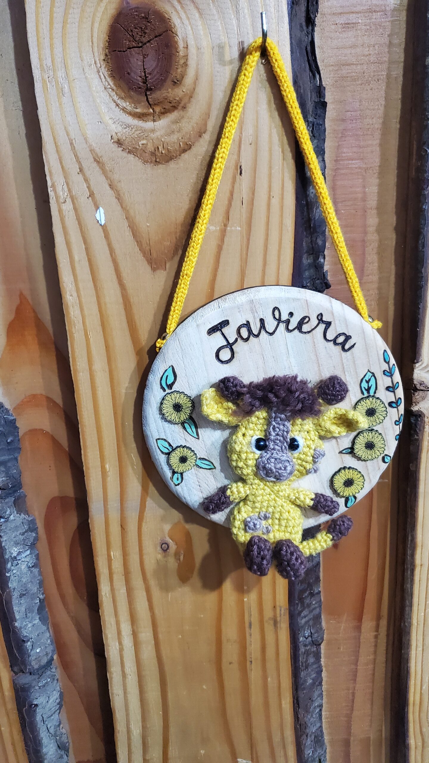 Letrero con nombres madera y animal tejido